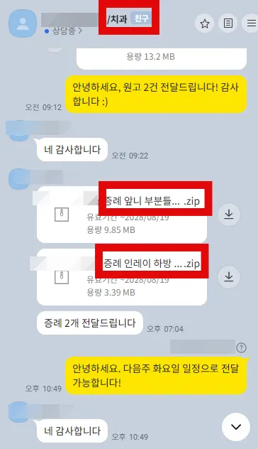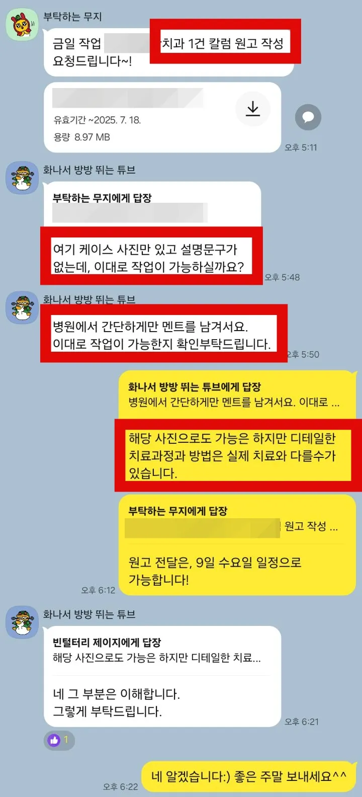 사진 작업 필요 시 : 원고 내용에 맞춰, 치료 부위 표시 등 이해를 도울 수 있도록 사진도 같이 작업해서 전달드립니다.